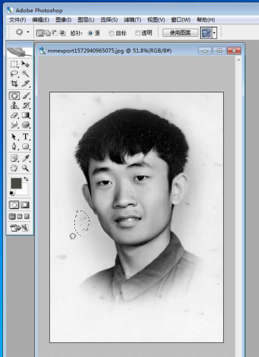圈住有脏点的地方往好的地方移动,脏点自动被覆盖替换,同样的操作去除所有脏点破损。保存,完成整个照片修复。