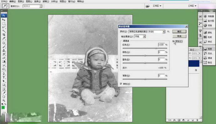简介原图: 效果图: PS打开原照片 使用通道混合器,将图片调为黑白色调. 使用蒙尘与划痕将照片上小脏点先去掉,大的脏点进行二次祛除. 复制一个新图层,再次使用蒙尘与划痕,这次的参数不